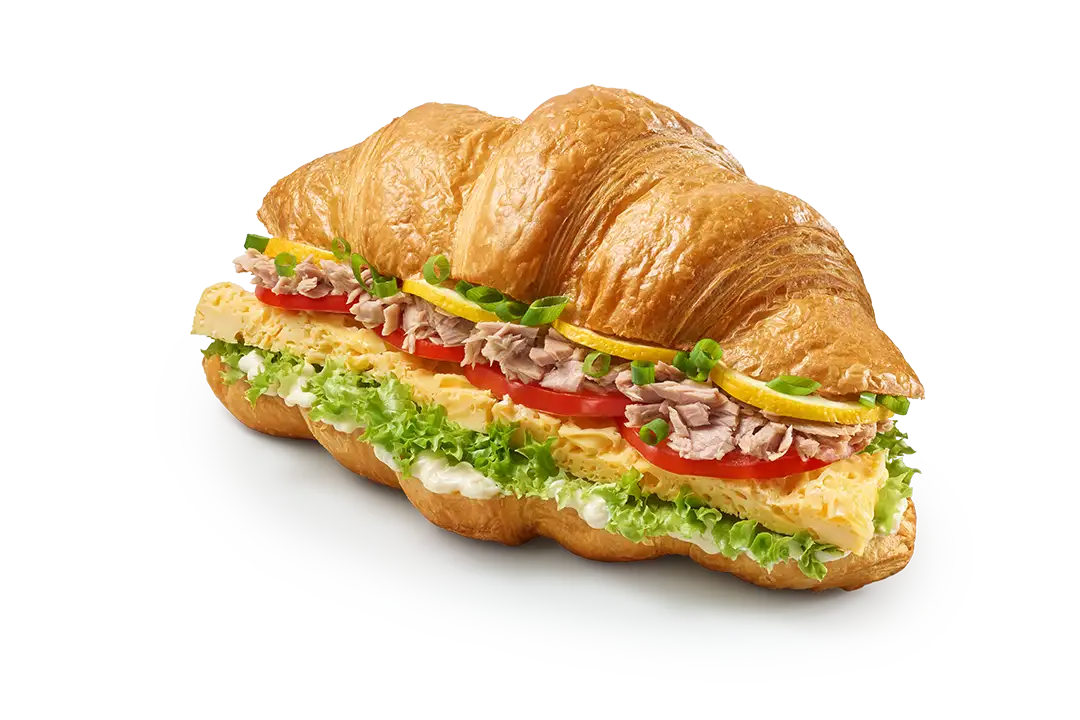 круасан, тунець, зелена цибуля, яєчня, помідор, лимон, салат Лолло Біонда, соус Класичний