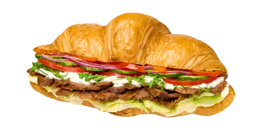 круасан, яловичина гриль, помідор, салат Айсберг, огірок, рукола, перець болгарський, маринована цибуля, соус Грецький йогурт, соус Цезар