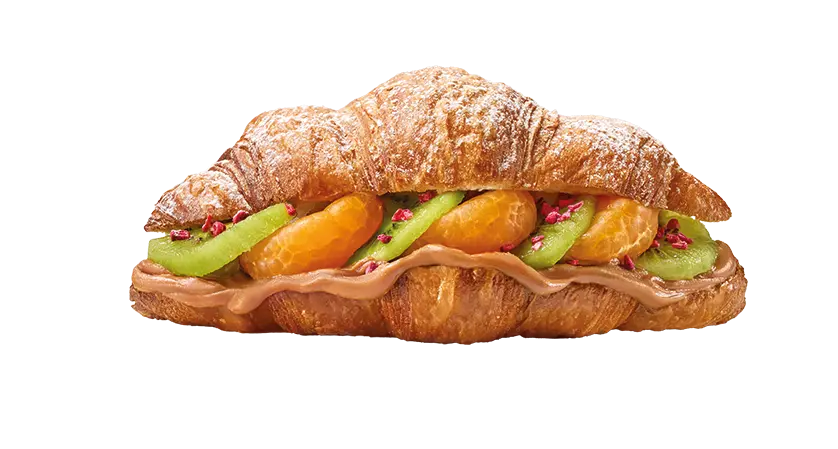 круасан масляний, ківі, мандарин, сублімована малина, бісквітна паста, цукрова пудра